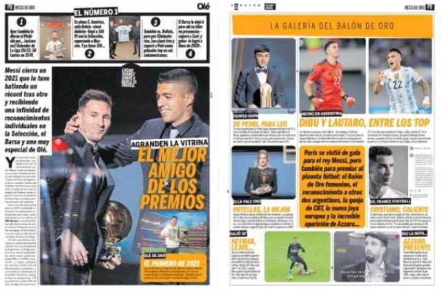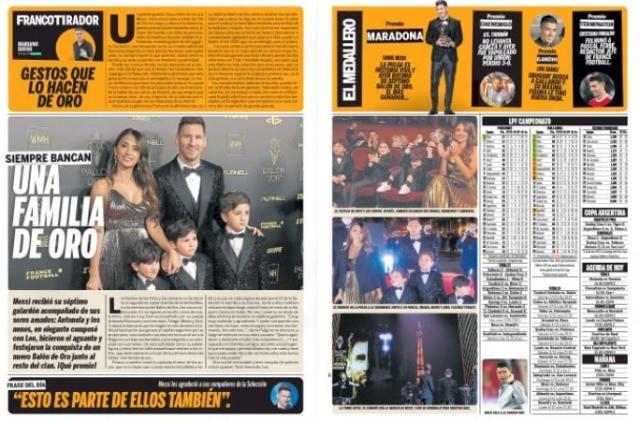 在长达8个页面的报道里,《奥莱报》赞美了梅西的“金色一家”,强调他的获奖和他作为“带头大哥”和阿根廷一起赢得美洲杯直接相关,凸出了梅西对莱万多夫斯基的认可,再搭配上“好哥们亲自来给颁奖”。