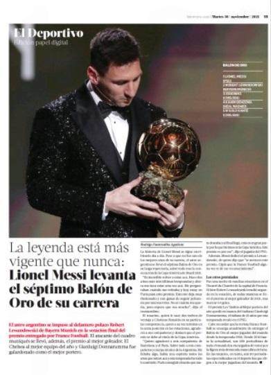 《民族报》把报道集中在国家队成绩帮助梅西赢得金球这个概念,该报认为,这个金球是梅西职业生涯一直缺少的——凭借在国家队的出色表现赢得的金球(文首配图)。
