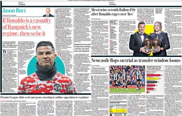 《新闻报》标题:“从梅西的第7座金球到C罗的批评”。